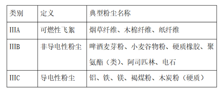 III A、IIIB andIIIClass C: Other combustible dust except for coal mine gas environment, as shown in the table below.